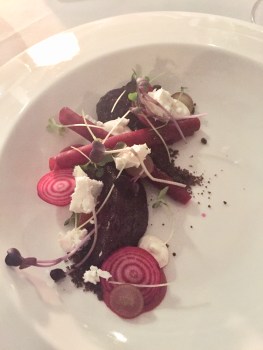 Previous Image Next Image IMG_3070 Roast Beetroot – beetroot rhubarb puree, smoked goats cheese, coffee crumb, pink peppercorn yoghurt, grape